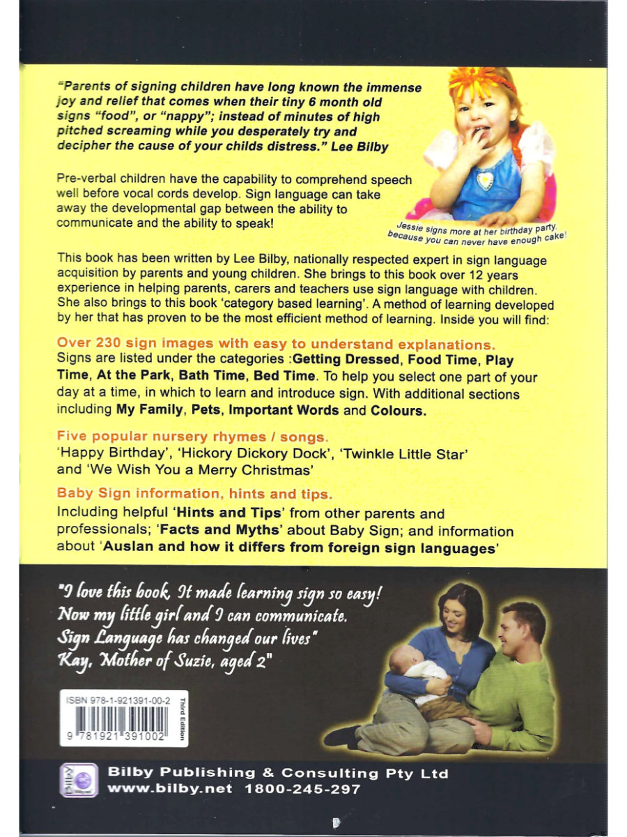 Over 230 sign images with easy to understand explanations Signs are listed under the categories :Getting Dressed, Food Time, Play Time, At the Park, Bath Time, Bed Time. To help you select one part of your day at a time, in which to learn and introduce sign. With additional sections including My Family, Pets, Important Words and Colours. Five popular nursery rhymes / songs. ‘Happy Birthday’, ‘Hickory Dickory Dock’, ‘Twinkle Little Star’ and ‘We Wish You a Merry Christmas’ Baby Sign information, hints and tips Including helpful ‘Hints and Tips’ from other parents and professionals; ‘Facts and Myths’ about Baby Sign; and information about ‘Auslan and how it differs from foreign sign languages’ There is also an alphabetical index at the back, to help you quickly look up signs; and now also includes a detailed list of Associations that can help parents.